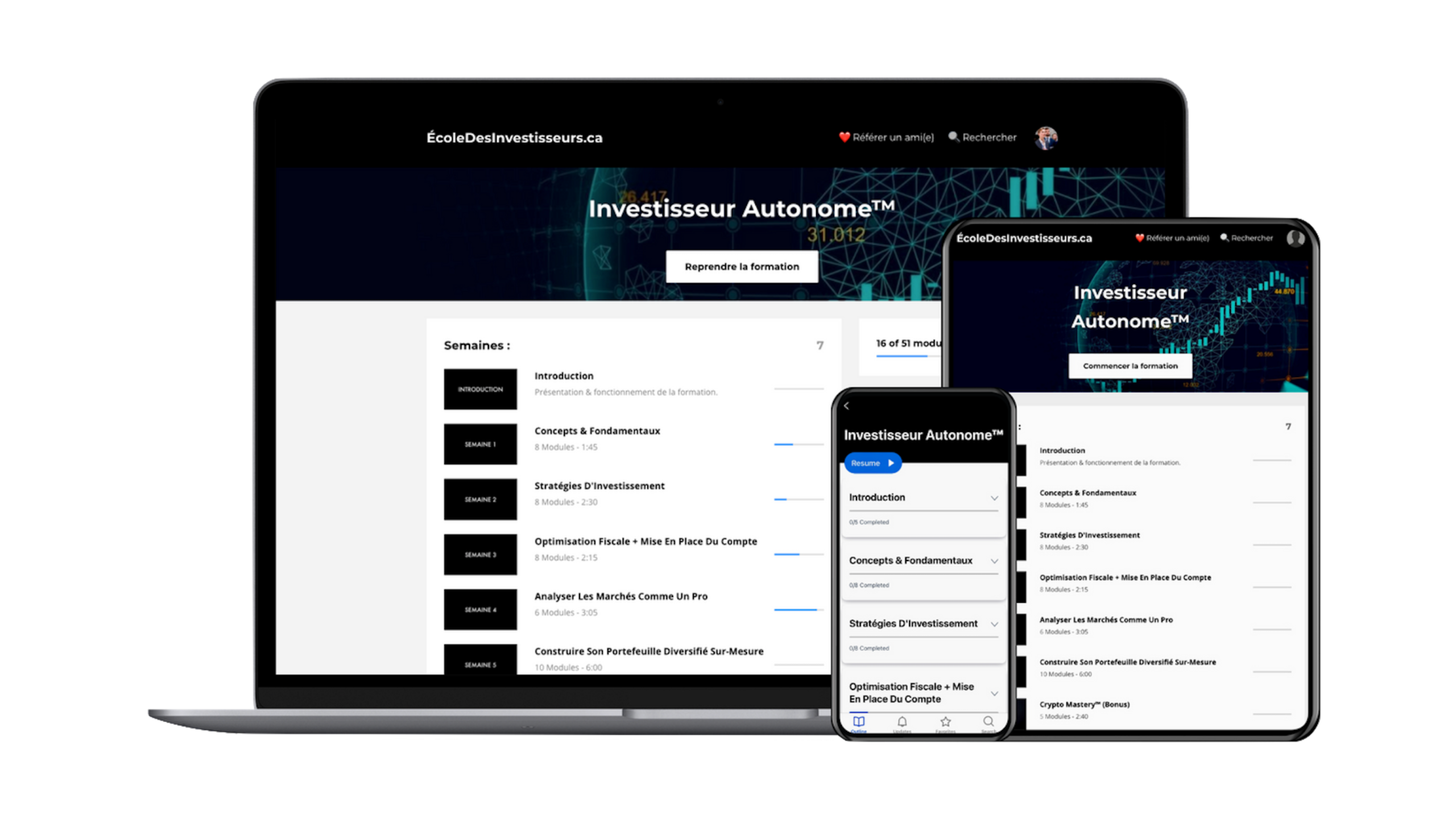Plus de 20 heures de formation étape par étape couvrants TOUS les aspects de l'investissement en bourse autonome au Québec. Stratégies d'investissement, analyse des marchés, construction de portefeuille, plateformes, fiscalité, assurances,... Cette formation contient tout ce dont vous avez besoin.